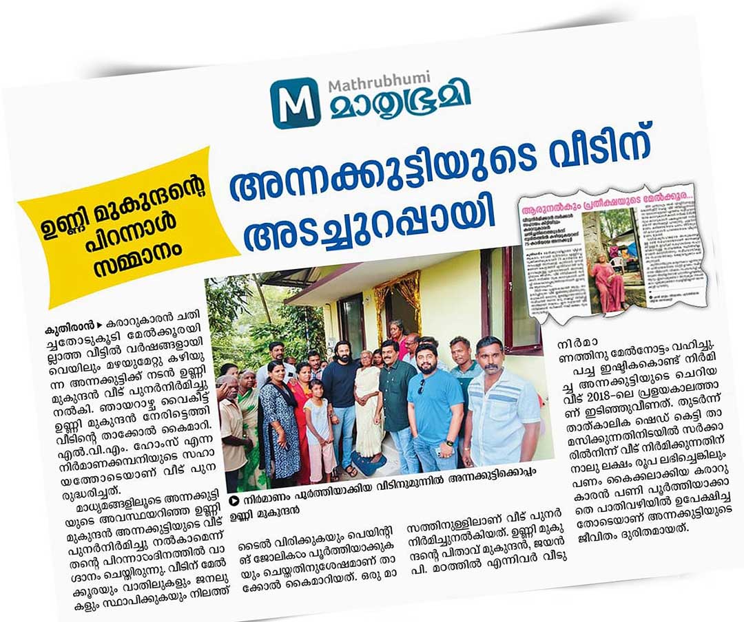 On his birthday, actor Unni Mukundan partnered with LVM Homes to rebuild the home of Annakutty, who had been living without a roof for years. After learning about Annakutty’s plight through media, Unni Mukundan promised to help, and LVM Homes took the lead in renovating and rebuilding her home. The key was handed over after completing tiling and painting work, with Unni Mukundan and Mukundan (Unni's father) personally attending the handover.